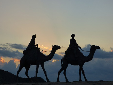 御宿町の海岸は、きめ細かくサラサラとした「白い砂」が特徴的で、静かな波音に包まれた広々とした浜辺に、ひときわ幻想的な存在感を放つのが「月の沙漠記念像」です。この記念像は、大正時代に生まれた童謡『月の沙漠』の世界を表現したもので、夕暮れ時になると、西の空に沈む夕日を背にシルエットとなり、まさに詩の世界が現実になったような光景が広がります。