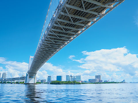 『芝浦・台場エリア』には、東京湾にかかるレインボーブリッジや対岸の東京の街並み、夜景や目の前に架かるレインボーブリッジが一望できるお台場海浜公園のほか、自由の女神像のレプリカなどが有名です。また、日の出桟橋からは海上バス・水上バスやクルーズ船などが運航しており、海からの東京観光も楽しめます。