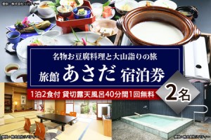 古くから信仰の山として栄えた「大山」への参道沿いにある歴史深い宿です。 大山の伏流水を使った当館自慢の貸切露天風呂は、開放感があり自然も満喫できます。 日本遺産認定大山詣りと、名物お豆腐料理をお楽しみください。 旅館あさだhttps://ryokan-asada.com/ 【注意事項】 ※事前予約が必要です。宿泊券が届きましたら、お電話にてご利用ご希望の日時をご連絡ください。(電話番号等は宿泊券に記載) ※ハイシーズン(お盆・年末年始・ゴールデンウイーク・紅葉シーズン)のご利用については、お問い合わせください。 ※人数の追加は別途料金がかかります。 ※詳しくはお問い合わせください。 ※画像はイメージです。 【事業者:有限会社 旅館 あさだ】 豆腐 宿泊券 郷土料理 ギフト 贈りもの 父の日 母の日 記念日 祝 贅沢