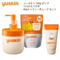 ひび、あかぎれ、しもやけを治す、黄色いビタミン系クリーム。 《 セット内容 》 ・ユースキン180gポンプ(容器、キャップ、ポンプ、パウチ) ×1 ・ユースキン180gつけかえパウチ ×1 ・ユースキン40gチューブ ミッフィーデザイン ×1 《 製品特長 》 ● 4つの有効成分が「ひび・あかぎれ・しもやけ」を治します(指定医薬部外品)。 ● 2つのうるおい成分がお肌にうるおいを与えます。 ● クリームの黄色は、水溶性ビタミンのひとつ「ビタミンB2」の色です。 ● スッとする香りは、有効成分「dl-カンフル」の香りです。 ● 塗ったあとすぐに肌がうるおい、優れた保湿効果が持続します。 ● お肌に合えば全身にお使いいただけます。 ● みんなで使えて衛生的なポンプタイプと、ユースキンポンプ専用つけかえパウチ、持ち運びに便利なチューブタイプのセットです。 ● ユースキンポンプは中身がなくなったらパウチをつけかえできます。