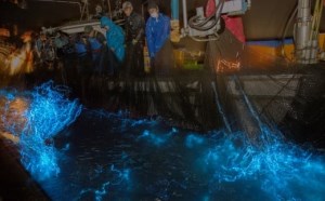 春になると、滑川の海岸一帯には、富山湾の深海からの使者「ホタルイカ」が訪れ、神秘的な青白い光を放ちます。その「ホタルイカ群遊海面」は、国の特別天然記念物に指定されており、早朝からのホタルイカ漁を観光船から見学する「ほたるいか海上観光」ではホタルイカの神秘の光や漁師たちの漁の様子など、普段見ることのできない貴重な体験ができます。