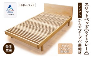 湿度の高い北陸で生まれた【日本のベッド】 すのこベッド「スリットベッド」。 スリットベッドは無垢材と縦すのこ構造で「ベッドヘの上り降り、寝返り時に出るきしみ音」「腰痛の原因になりやすい、体重の重みにより発生するたわみ」「カビ、ダニなど、緊殖しやすい、ジメジメ湿気」のお悩みを解消! 縦すのこ構造により、一般的な横すのこにはない強度が生まれ、きしみ音やゆがみが抑制されます。 また、板の厚さと隙間幅に工夫があり、強度と通気性を考慮した絶妙のピッチ。 敷布団との設置面積を半分以下にすることで、通気性が高まり湿気を放出。 何度も試作し辿り着いた、きしまない、沈まない、湿気らない、縦すのこ構造!