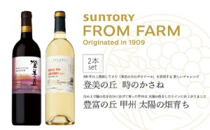 ・サントリーフロムファームシリーズ 登美の丘 赤 時のかさね 750ml 1本 作り手の新たな挑戦として実現した「時のかさね」。ヴィンテージに制約を受けずにうまくアッサンブラージュしました。熟成期間の異なる4つのヴィンテージからなる12品種、200以上の原酒を重ね合わせることによりフレッシュな果実味から熟成のまろやかさまで多層な味わいを1本で贅沢に感じられるワインです。 ・サントリーフロムファーム ワインみらい 豊富の丘 甲州 太陽の畑育ち 750ml 1本 日照時間の多い山梨県の盆地を利用し、多くの陽を浴びることで色づきが進む「甲州」を育てることによりまるで太陽のような色合いのワインに仕上げました。 また、水分のコントロールや特殊な栽培方法により凝縮感のある実を作り、果実を丸ごと詰めたようなワインになりました。 ※20歳未満の飲酒は法律で禁止されています。 ※20歳未満の方のお申込みはご遠慮ください。