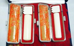 卓越した職人が歴史と伝統ある山梨文字にて、真心を込めて彫刻する印鑑です。 実印用の18mm、銀行印用の13.5mm、の2本セット。 貴重なアフリカゾウの牙を使用。種の保存法に基づく「認定シール」付。 別珍2本入りの収納ケース付