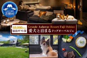 ~大自然に囲まれた富士山の麓で、愛犬とともに宿泊ができます~😄🐶🎵 山梨県忍野村に、県内初のペット同伴型ドッグオーベルジュ""グランデ オーベルジュリゾート富士忍野""が誕生しました。 オーベルジュとは「宿泊できるレストラン」のこと。🍴 上質な旬のお食事とワインを愉しめます。😋✨ 、 忍野の里の自然を望む、良質な天然水の客室風呂を全室完備。 自然が創り出した美しい景観を、お部屋からお楽しみいただけます。 🦴🐶愛犬同伴可能なラウンジスペース🐶🦴 チェックインからディナーの時間までフリードリンクとわんちゃん用手作りアイスをご提供。 薪ストーブのある心地よい空間でおくつろぎください。 【内容】 Grande Auberge Resort Fuji Oshinoで利用可能な ≪60,000円分宿泊ギフト券≫ 愛犬と共に、素敵な思いでを作りませんか!!💖🐶🥰