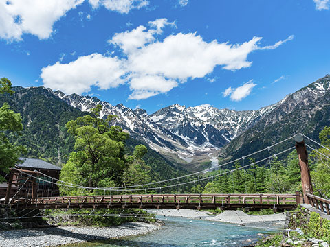 標高1500mの上高地はその美しい景観から「特別名勝」と「特別天然記念物」のふたつの称号を与えられた日本でも稀有な場所です。目の前に広がる、雪をまとった3000m級の穂高連峰は見る人を魅了します。北アルプスの玄関口として、毎年多くの登山客が訪れます。