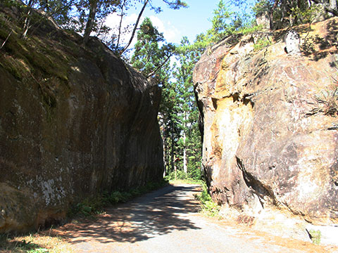 古の往来を今に伝える「切通し」が二ヶ所あります。「大切通し」は長さ26m、高さ6m余。1580年に切り開かれ、その後も3回の普請が行われました。岩山の右壁面上部に、その碑文が彫られています。