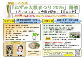 3年ぶり15回目の開催決定! あまもっくらな味「ねずみ大根」の魅力を満喫するお祭りを開催します!令和7年11月9日(日)は、ぜひ坂城町へお越しください! イベントの注目ポイント ●ねずみ大根 収穫体験! 坂城インター線沿いの畑で、ユニークな形がかわいらしいねずみ大根を自分の手で収穫できます! ●「あいさい」に大集合! さかき地場産直売所「あいさい」では、旬の地域農産物や加工品がずらり!さらに、新酒ワインの限定販売もあります ●特別ゲストがやってくる! 塚本颯来さんと森青葉さんをお迎えして、写真撮影会を実施!
