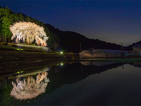 白川町水戸野地区にある樹齢400年のシダレザクラ。エドヒガンザクラの一種で、昭和42年に県の天然記念物に指定されました。毎年3月下旬から4月上旬に開花し、淡い紅白色の花を咲かせ、訪れる人を魅了します。夜にはライトアップされ、目の前の水田に映る鏡桜は幻想的です。