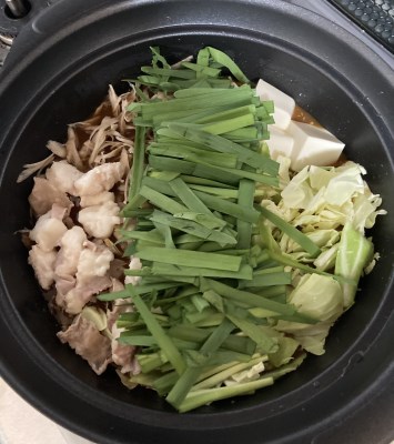 2.お好みの野菜と、さっと湯通ししあく抜きしたもつを一緒に入れて、具材に火が通ったら出来上がりです。