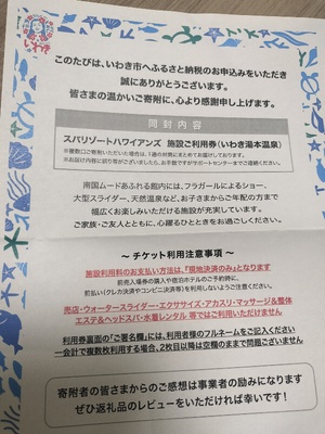 11月にハワイアンズに行くのですが、たまたま見ていたふるなびに、施設利用券があり、速攻でふるさと納税しました。発送も早く4日で届きました。売店やウォータースライダーには使えないようですが、宿泊代の足し ... 続きを読む