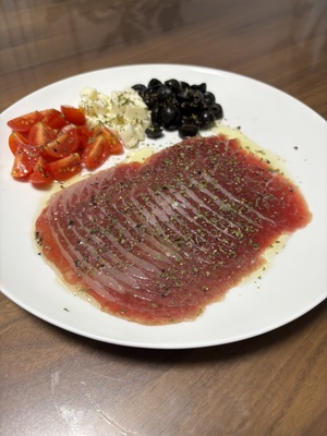 和牛の生ハムは初めて食べましたがとても美味しくいただきました。私のお酒のつまみとして塩胡椒、少量のおろしにんにく、オリーブオイル、パセリ、バジル、トマト、チーズ、ブラックオリーブで準備したのですが、小 ... 続きを読む