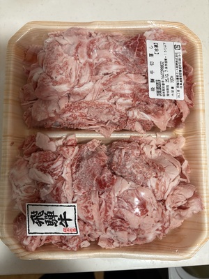 鮮度抜群の切りたての飛騨牛切り落しを1つのトレーに350gずつ2盛りにしました。