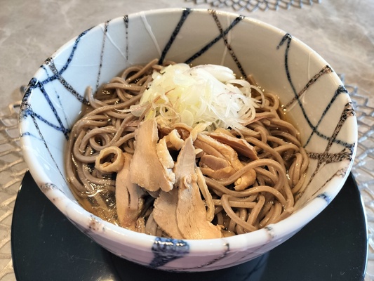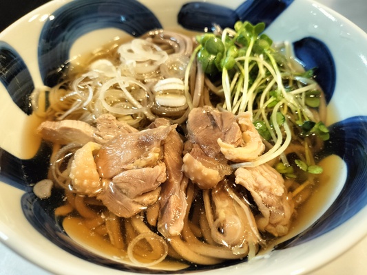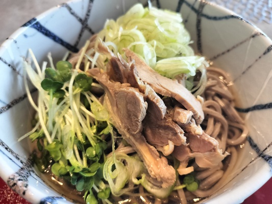 冬でも大人気の「冷たい肉そば」は親鶏の歯ごたえと、コクのあるつゆの相性が抜群。鶏肉の入ったストレートつゆが付いた、本場山形のご当地麺「冷たい肉そば」です。