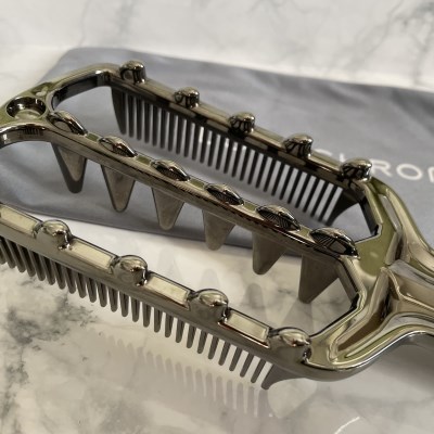 背面には頭皮へのマッサージ代用機としての「カッサ刃」。やさしく頭皮に押しあて、点押しすることで凝り固まった頭皮をほぐすことに最適。