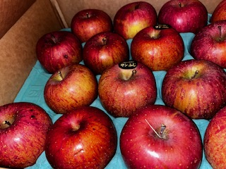 こちらの返礼品は、風によって揺れたりんごが枝や実に当たって傷がついたり、部分的な日照不足によって色がつかなかったり、時間が経過して若干軟化してきたもの、変形果、小さなりんごたちが混じってます。
