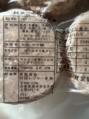 現在は「阿波牛使用の合い挽きハンバーグ」と正確に修正し、保存料・着色料等の添加物を使用していないことを事業者へ確認したうえで表記しております。