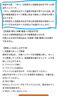 商品紹介は「のべの阿波牛と淡路島玉ねぎで作った阿波牛ハンバーグ。その阿波牛と淡路島玉ねぎで安心安全無添加の美味しいハンバーグをお弁当サイズの80gでお届けいたします。」ですが、届いた商品はアメリカ産の ... 続きを読む