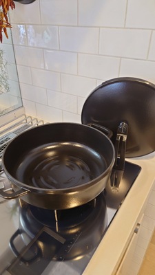 | 容量 | ■カラー:マットブラック ■寸法(mm):直径260 [幅(取手含)338×高さ(リッド含)158 深さ83] ■容量:4.0L ■重量:3.6kg |