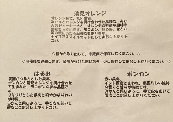1、清見オレンジ、2ポンカン、3はるみの3種類が届きました。デコポンが大好きなので入ってなかったんだけど全部とってもおいしかったです。