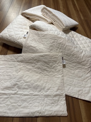 | 容量 | ・パットシーツ シングル きなり 2点:約110cm×210cm ・キルトケット シングル きなり 2点:約145cm×240cm ・まくらカバー きなり 2点:約46cm×68cm |