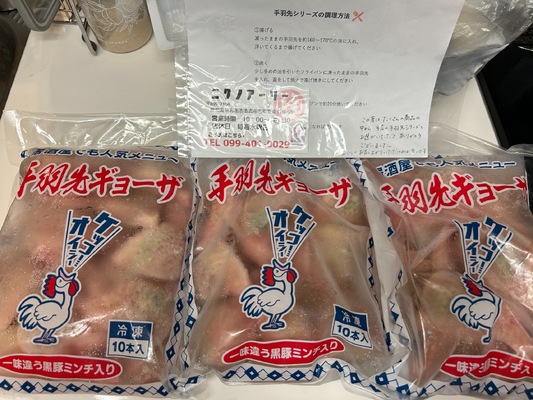 近隣の県(鹿児島県内含む)から仕入れた鶏の手羽先を骨抜きし、自社で製造したギョーザの具を中に詰め、具詰めした手羽先を冷凍し、袋詰め・梱包したもの