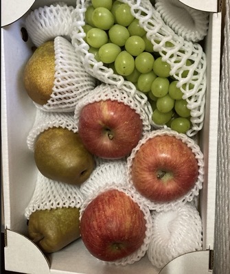 ラ・フランス、サンふじは各3~5玉、シャインマスカットは1房をきれいに並べてお送りします。