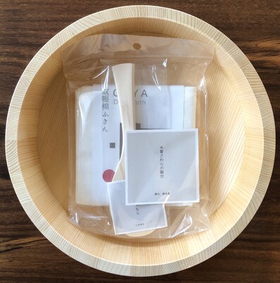 木曽さわらの柾目板の赤身材のみを厳選したさわらの飯台。しゃもじとふきんのセットです。
