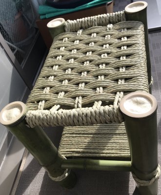 直径が8~9cmの真竹を根元の厚いところのみを脚に使い、い草特有の艶々しい縄で底面を仕上げました。