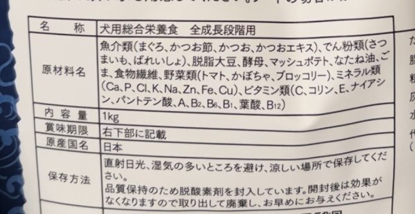 【原材料】魚介類(まぐろ、かつお、かつお節、かつおエキス)、でん粉類(さつまいも、ばれいしょ)、脱脂大豆、酵母、マッシュポテト、なたね油、ごま、食物繊維、野菜類(トマト、かぼちゃ、ブロッコリー)、ミネラル類(Ca、P、Cl、K、Na、Zn、Fe、Cu)、ビタミン類(C、コリン、E、ナイアシン、パントテン酸、A、B2、B6、B1、葉酸、B12)