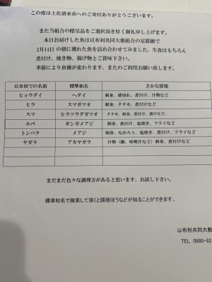 電話で嫌いなもの、食べれないものなど丁寧な対応でした。土日休みに調理できるように送って欲しい、刺身に出来るもの希望と電話でお話ししました。