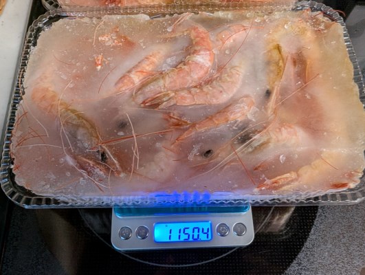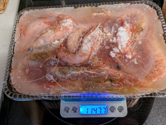 冷凍でも水と一緒に冷凍している海老は初めてです。氷を除けば1キロかもしれませんが、水多めにされていると1キロの海老か分かりません。実際いただきましたが、予想より少な目。味は生食でき、美味しいです。