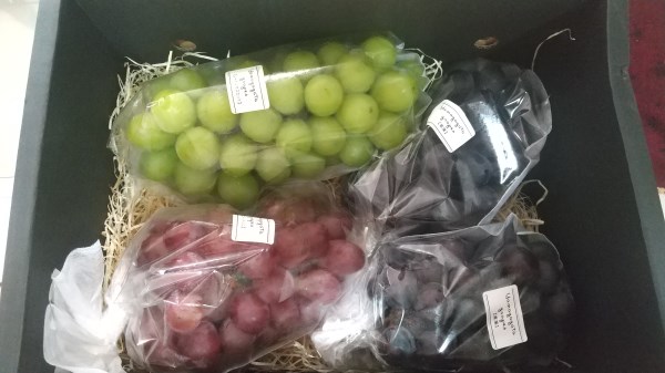 「巨峰」、「ピオーネ」、「高尾」、「ロザリオロッソ」、「シナノスマイル」、「安芸クイーン」、「ゴルビー」その他いろいろな品種の中から、いずれか2種。それぞれ1~2房ずつ、合計約1.8kgをお届けします。