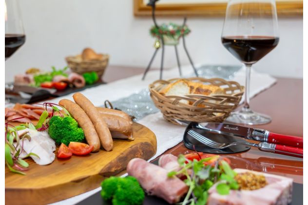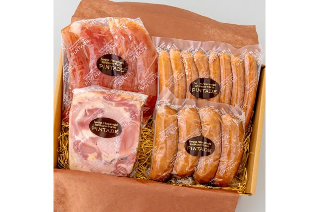 ホロホロ鳥だけで作ったハムとソーセージの詰合せ。焼いて風味を楽しめるソーセージや、部位ごとの食感が楽しいハム、酒の肴にぴったりなササミジャーキー入り。