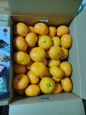 箱を開けると大きなミカンがびっしりと入っていました。中くらいの大きさを一つ食べたところ皮も剥きやすく、ジューシーで甘いミカンでした。