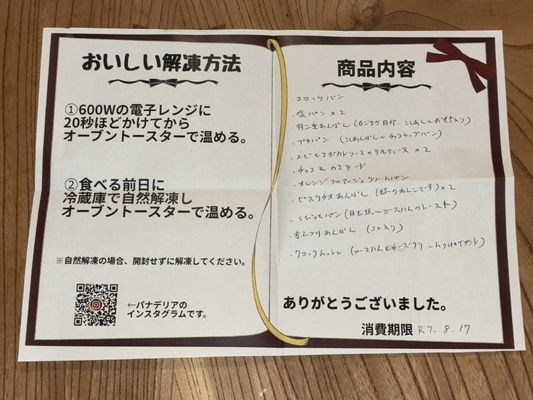 大小さまざまなパンが14個入っており、賞味期限は冷凍でおおよそ3週間前後でした。商品内容が手書きで記されており、とても親しみを感じました。