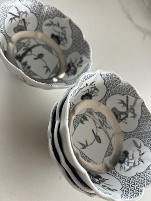 モダンでおめでたい柄の小鉢。吉祥文様である竹、すすき、牡丹を五方と中心に配し、