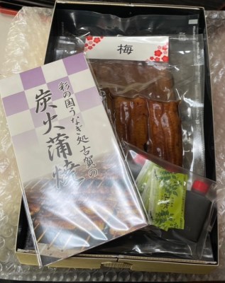 浦和の人気店うなぎ処古賀さんの鰻で、梅の蒲焼が3人前に別途タレと山椒が入っておりました。冷凍便で届きます。