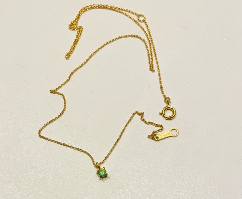 石のサイズが小さいからどうかなと思ったんですがちょうど求めていたサイズでした。グリーンもきれいで拡大鏡でライトをあてて見てみましたが、カットもとてもきれいでした。チェーンはシルバーに金メッキタイプです ... 続きを読む