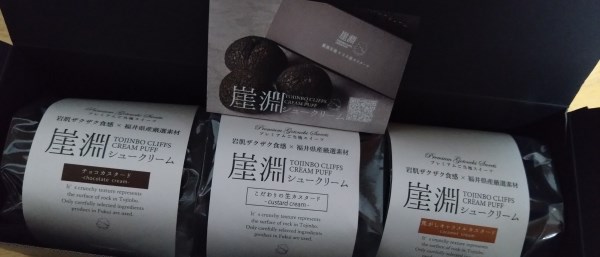 崖淵シュークリームは世界三大奇勝と言われている東尋坊の岩石をイメージして作られており、