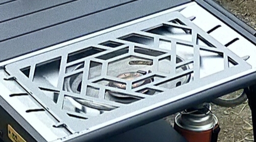 フラットバーナーのカスタムパーツになります。黒皮鉄板の厚さ4.5mmをレーザー加工しています。ドッシリと重いので重量感あります。取付・取外しも簡単なので様々なシーンに対応可能です。
