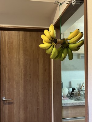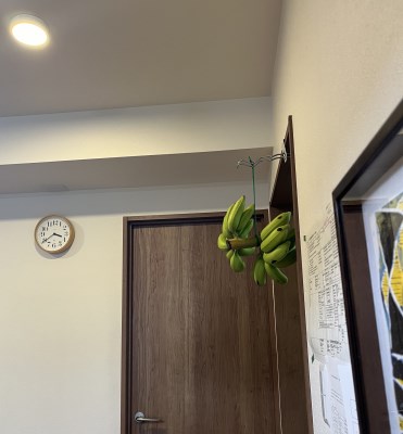 青々した状態で我が家にやって来た島バナナ。リビングに吊るして毎日観察しながら、熟れていくのを楽しみに待ちました。