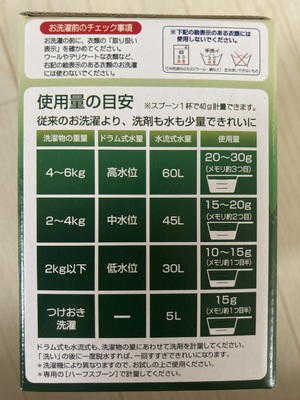 何年もこの洗剤を使っています。市販の洗剤より価格は高いですが、60Lの水量で洗濯する場合、20〜30gの使用量と表示してますから、市販の粉洗剤の半分くらいの量で洗えるので割高だと思いません。購入頻度も ... 続きを読む