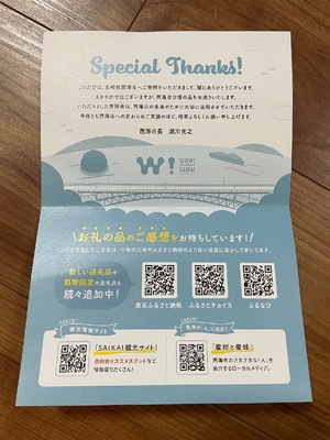 西海市は令和7年9月26日付総務大臣通知「ふるさと納税の対象となる地方団体の指定について(通知)」にて、地方税法(昭和25年法律第226号)第37条の2第2項及び第314条の7第2項の規定に基づき、ふるさと納税の対象となる地方団体として指定されました。