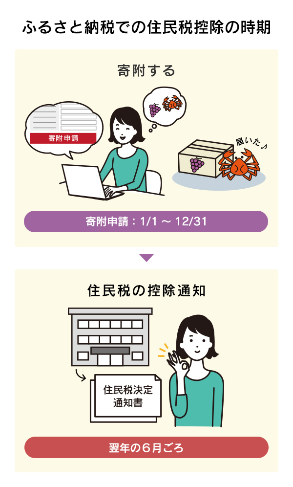 寄附翌年の6月から翌々年5月までの1年間、12回に分けて住民税から毎月減額されます。