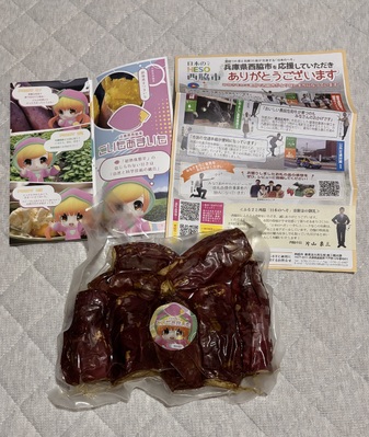 寄附をしてから1週間ほどで届きました。小ぶりの焼き芋が10個、真空パックの冷凍の形で届きました。数も数なので家族がそろったときに食べるように冷凍庫に眠っていますが、きちんと平らに並んでいるので場所はとりません。味のレポートができませんが今から楽しみです。