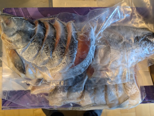 開梱し、鮭はぼ丸ごと一匹、想像していたより大きくびっくりしました。