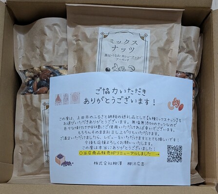 残りの金額で頼めるミックスナッツがないかと探していたところ、380gが3袋で5000円、しかも年末のギリギリまで受付てくれるという神対応、迷わずこちらに決めました。12/28に申し込みましたが、年末年始にも関わらず年内に受付完了のお知らせをいただけました。迅速な対応に感謝します。
