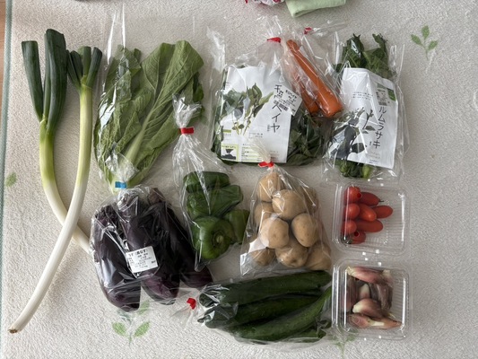 内容は人参、サツマイモ、つるむらさき、ナス、かぶ、長ネギ、ジャガイモ、ししとう、セロリ?、茗荷、生姜が入ってたらしく二人暮らしにはとても助かると喜んでました。