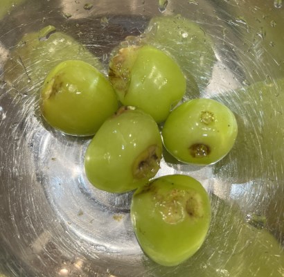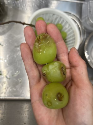 しかし、2房入っていましたが1房の中に7粒も、食べられないほどグジュグジュ茶色い穴があいた汚い粒が入っていました。
